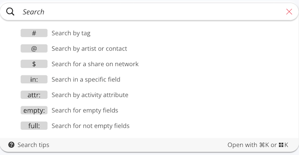 Artshell offers an advanced search system that enables you to find words across the Artworks, Contacts, Artists, and Events sections, as well as within attached documents. You can perform searches either in full-text mode or by using search operators.