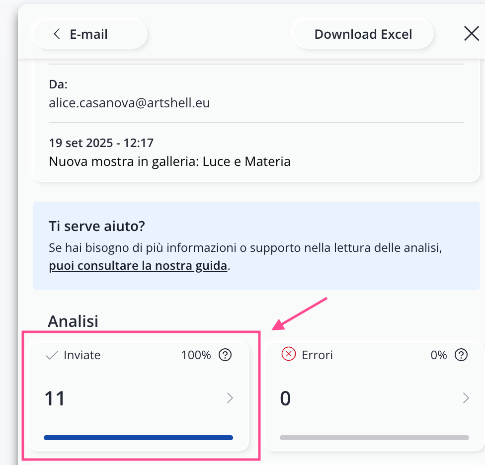 Per ottenere il report, clicca sul tasto Download Excel in alto a destra nella pagina Analisi.