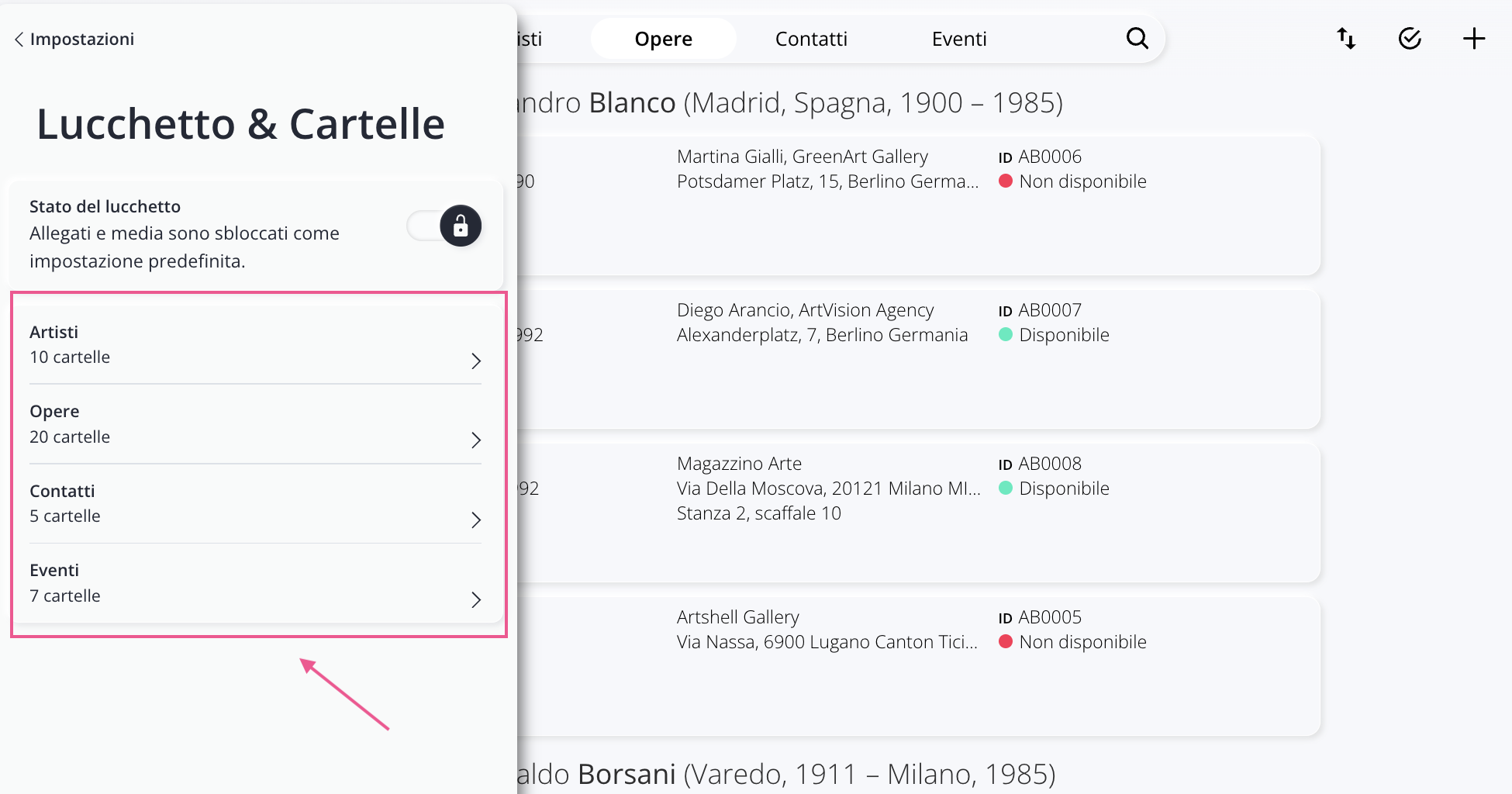 Dal Pannello Impostazioni - icona in basso a sinistra - cliccando la voce Lucchetto & Cartelle, trovi l’elenco delle quattro sezioni che supportano le cartelle (Artisti, Opere, Contatti ed Eventi) con il numero totale di cartelle presenti in ciascuna.