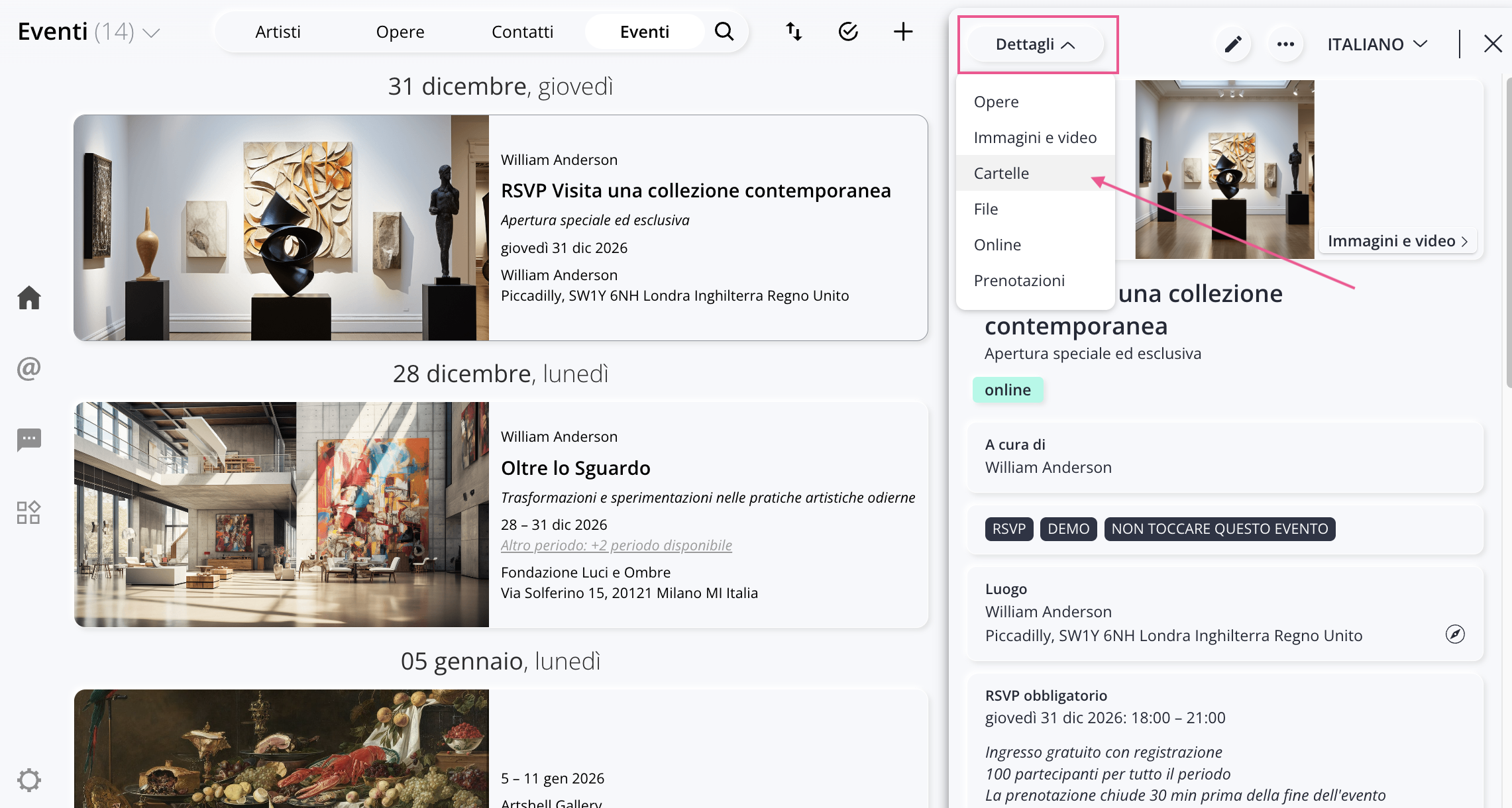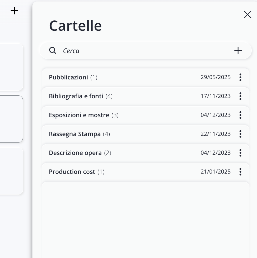 Le Cartelle rappresentano uno strumento flessibile e potente per organizzare contenuti aggiuntivi all’interno delle tue schede, mantenendo una struttura ordinata e facilmente gestibile. Utilizzandole correttamente, puoi arricchire Opere, Artisti, Contatti ed Eventi con materiali di approfondimento, documentazione e contenuti multimediali, senza compromettere la chiarezza delle informazioni principali. Una gestione attenta e ben pianificata delle Cartelle — sia a livello di singola scheda sia dal Pannello Impostazioni — ti consente di mantenere il pieno controllo sui contenuti condivisi o esportati, garantendo sempre una presentazione professionale e coerente con le tue esigenze.