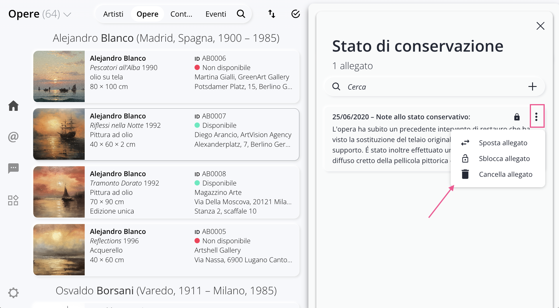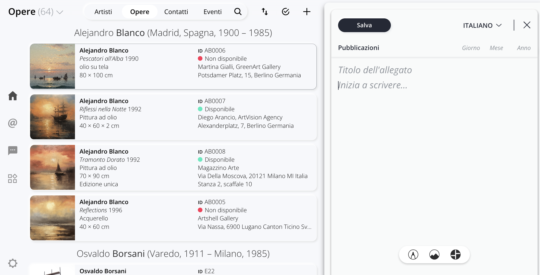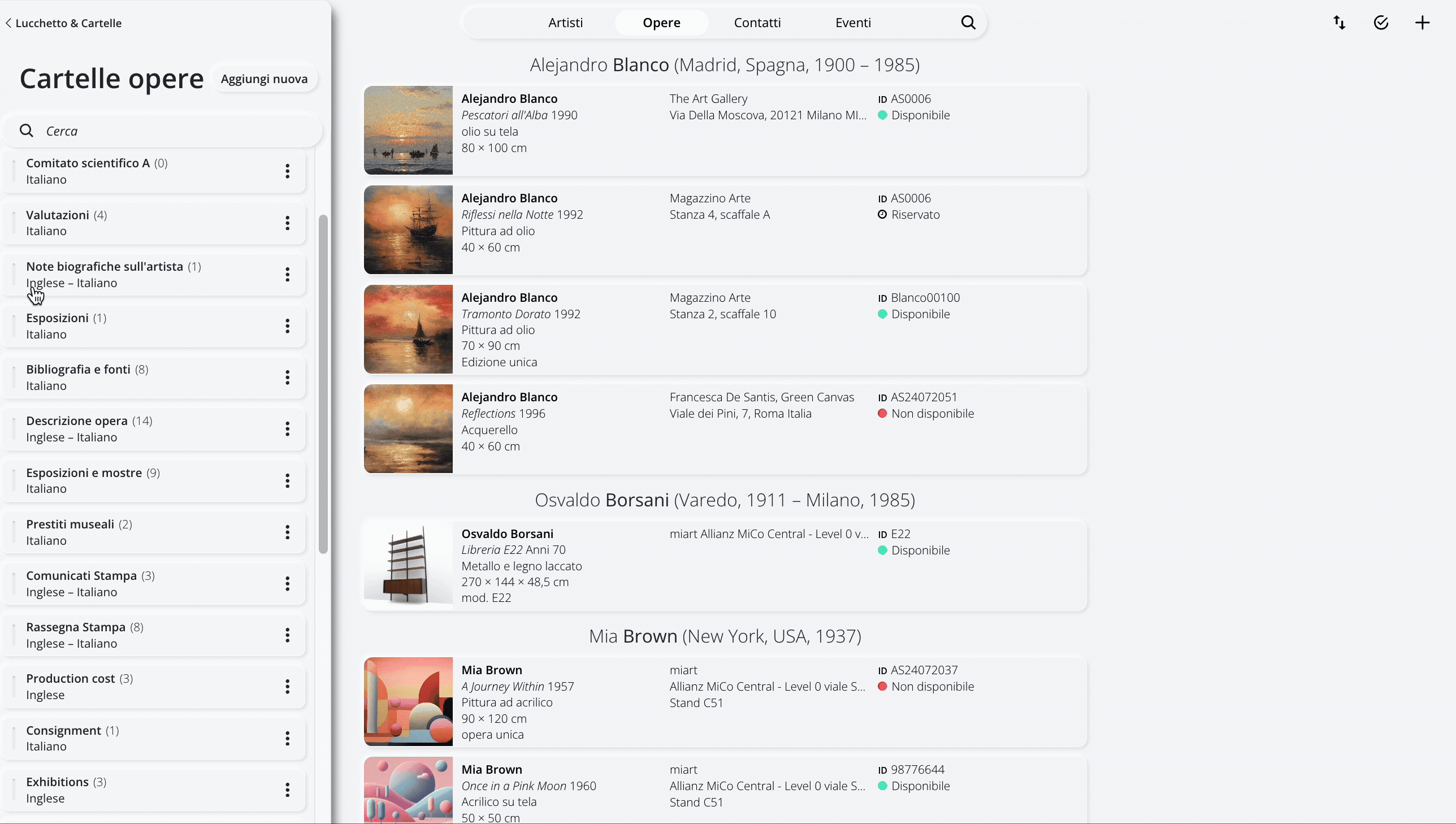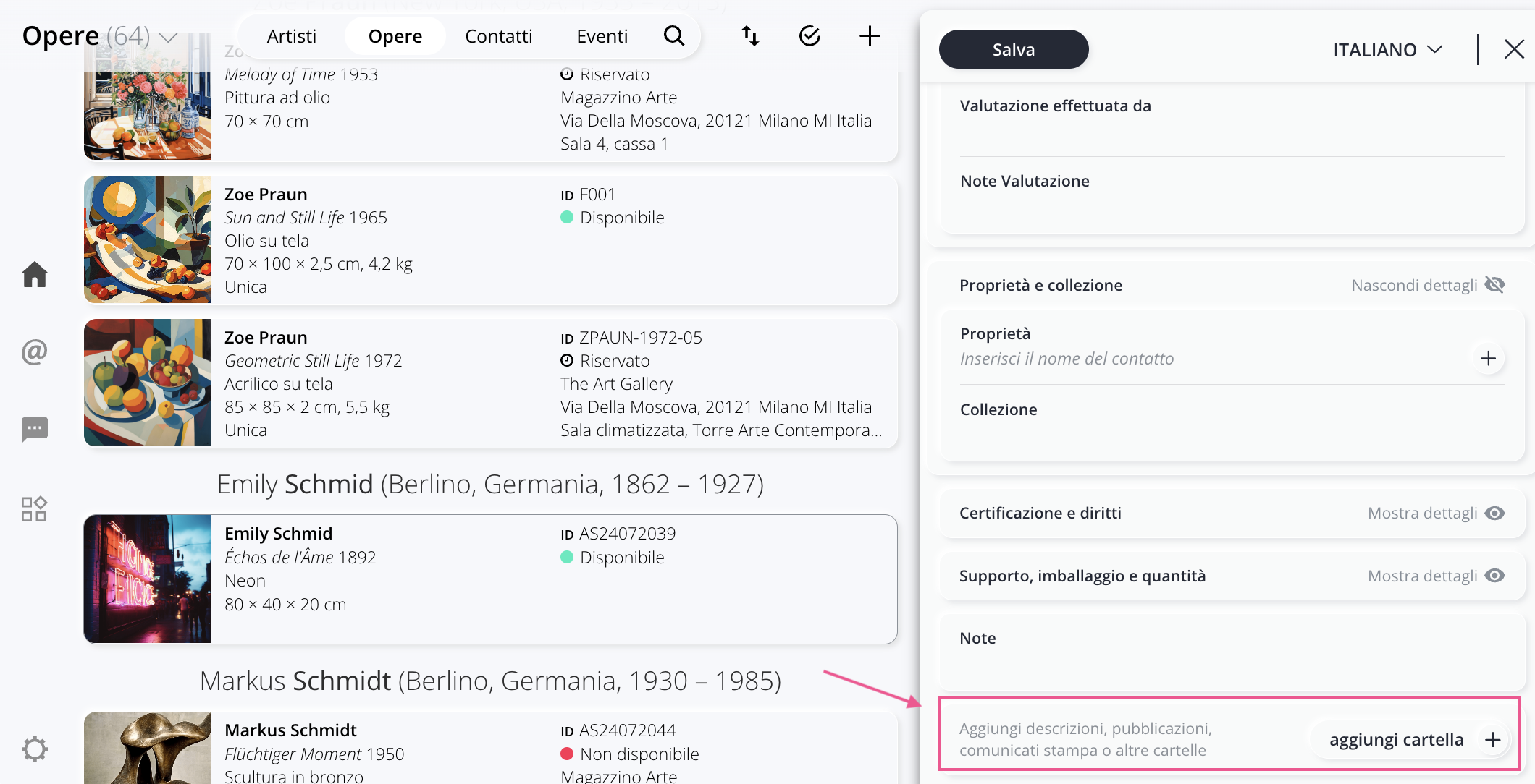 All'interno della sezione Opere puoi creare cartelle in cui organizzare pubblicazioni, descrizioni dell'opera, fatture, condition report, ecc. Puoi quindi creare le cartelle che meglio si adattano alla tipologia delle tue opere da archiviare.