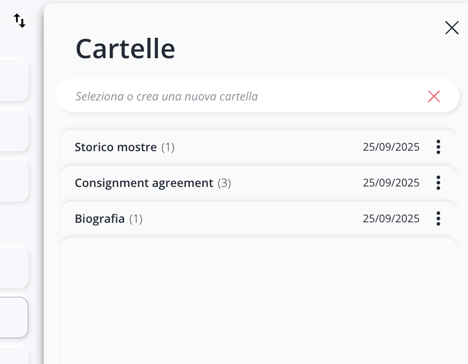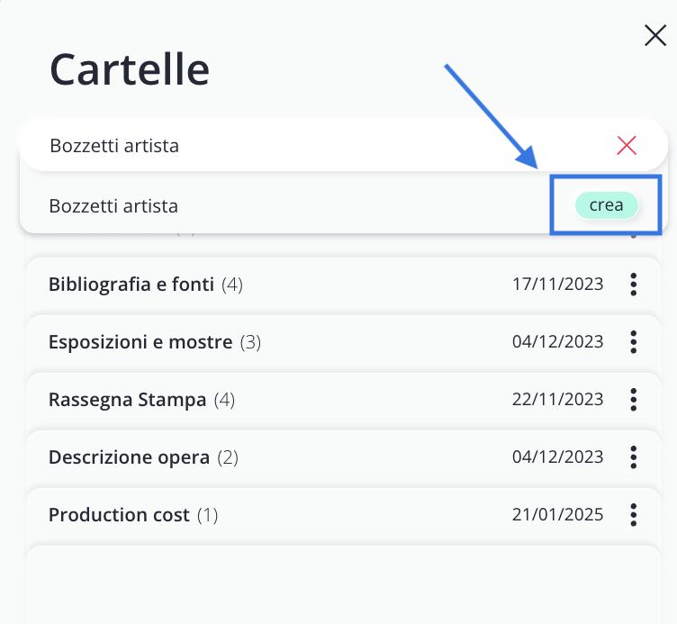 Se preferisci costruire il tuo archivio progressivamente, puoi creare le Cartelle direttamente all’interno delle singole schede, nelle sezioni Opere, Artisti, Contatti ed Eventi. Questa modalità è utile quando non hai la necessità di definire una struttura globale fin dall’inizio, ma desideri aggiungere cartelle in base alle esigenze che emergono via via nel corso del lavoro.